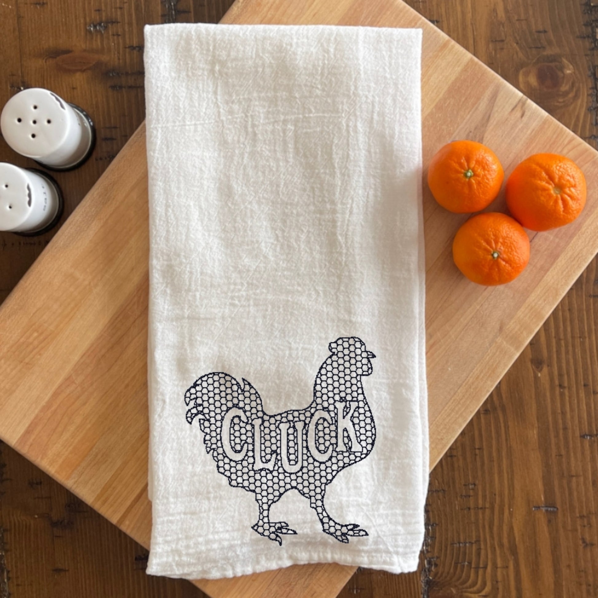 But what really sets this tea towel apart is the adorable embroidered chicken design in the center, complete with the word "cluck" in bold letters. To give the design even more rustic charm, it's set against a chicken wire background, adding texture and interest to the towel.