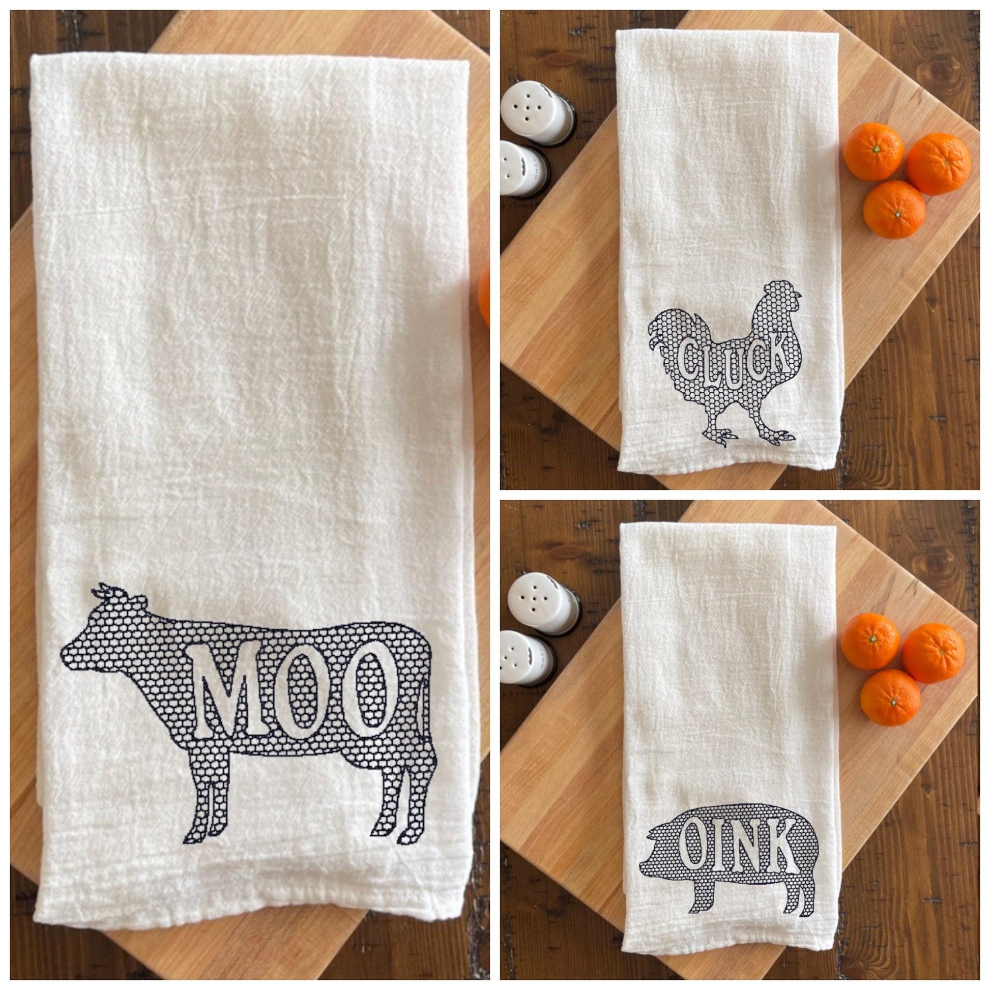 Cluck Chicken- Embroidered White Tea Towel - Farm Animals