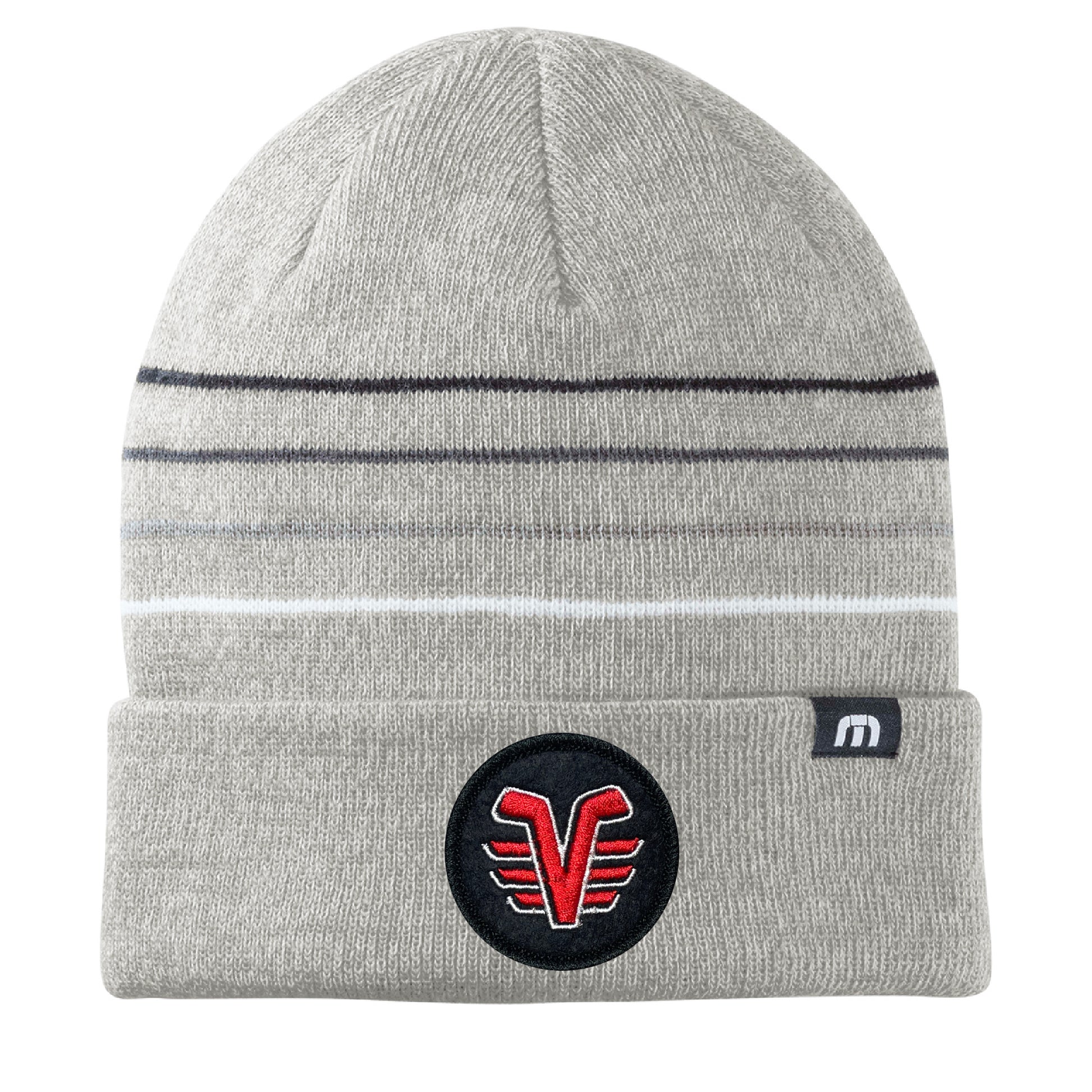 The Light Gray Travis Mathew Striped beanie is hard to beat. We designed a great patch and put the De Pere Voyageurs High School Hockey logo on it. This will keep your head warm and rep your team with a classic, simple, style.