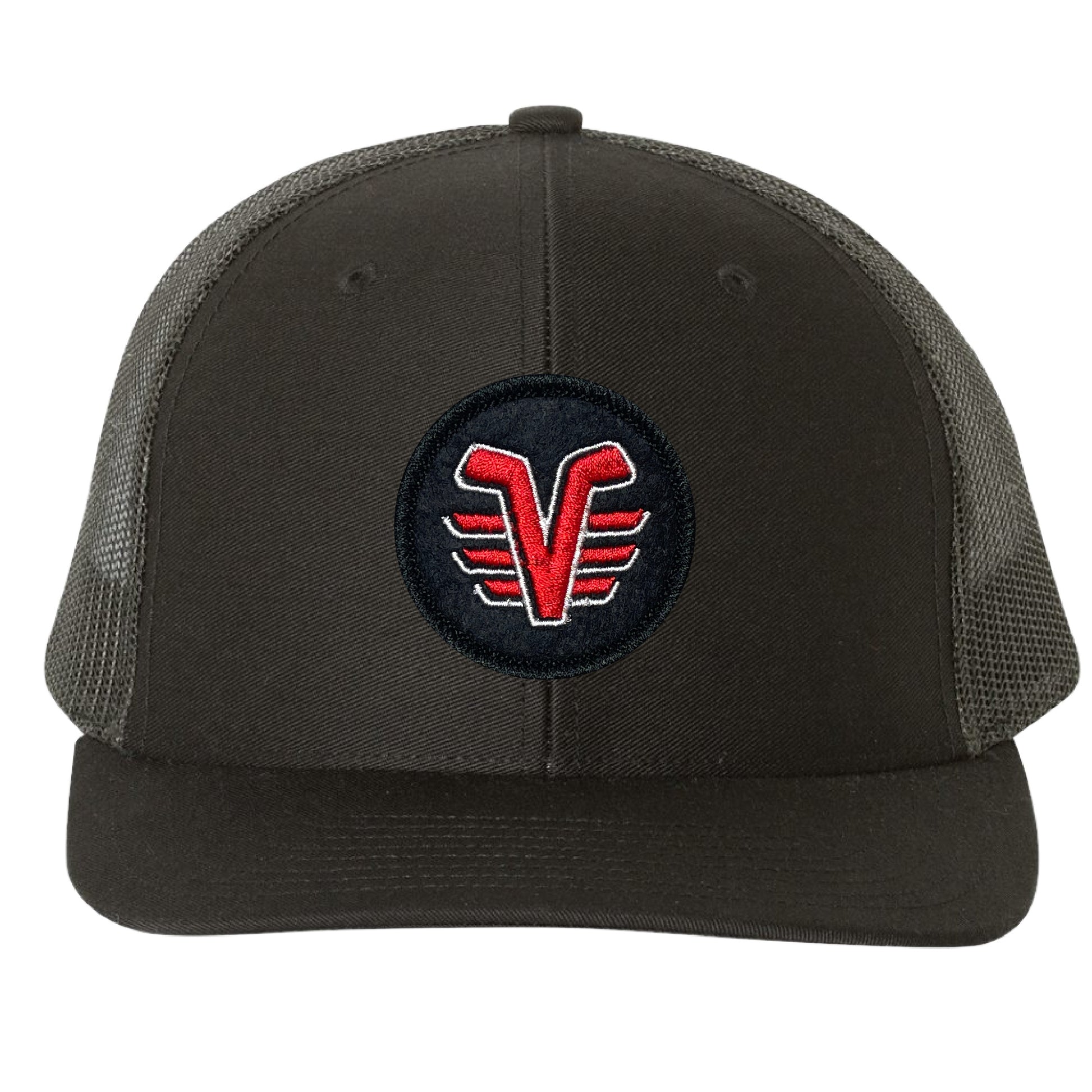 This is the De Pere, Wisconsin High School Voyageurs Hockey Team Logo Patch on our popular Low-Profile Richardson 115 Snapback hat. Show your Voyageurs pride in style with this all black snapback. This is one of our best fitting hats and a favorite in our shop, for years, in many different colors and patch styles.