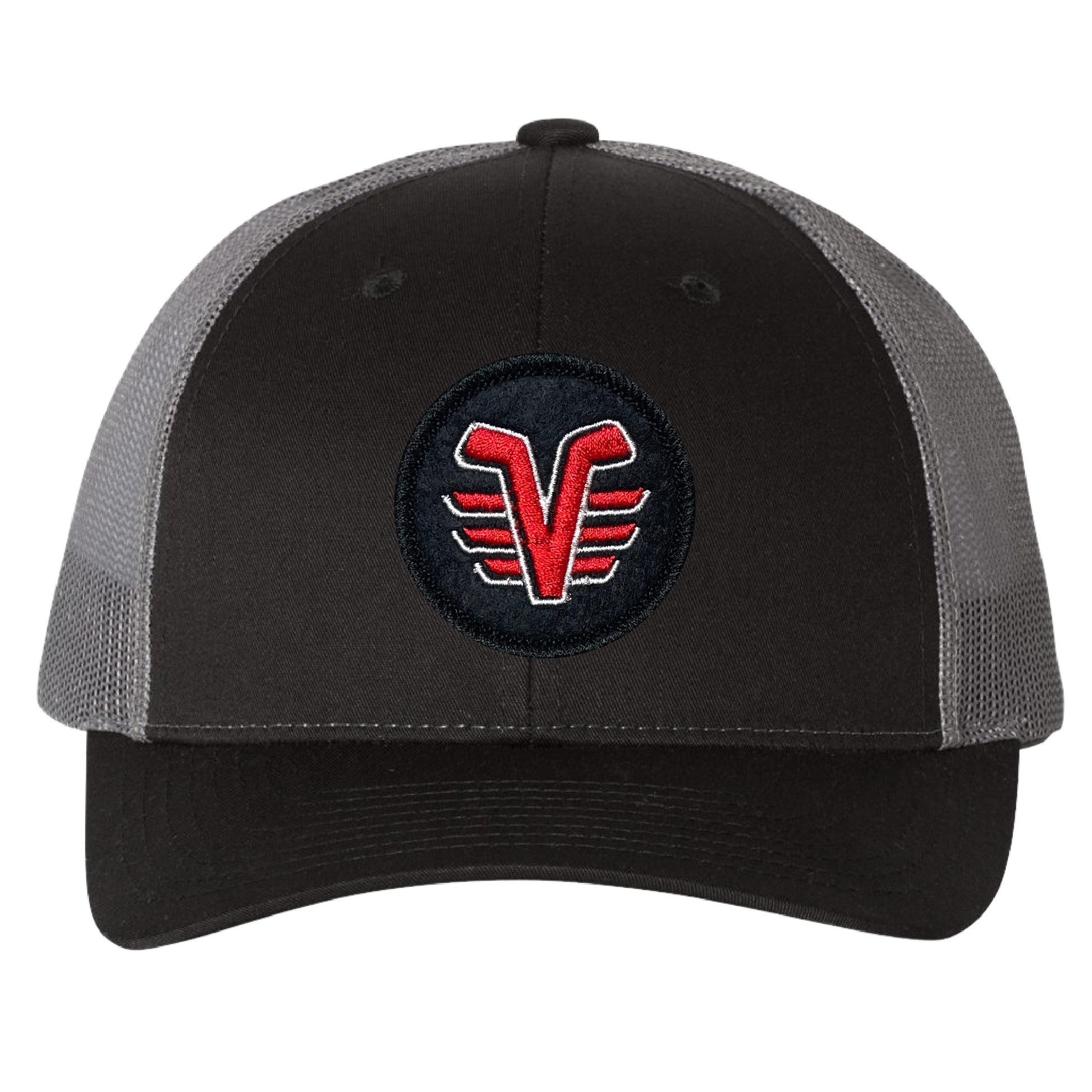 This is the De Pere, Wisconsin High School Voyageurs Hockey Team Logo Patch on our popular Low-Profile Richardson 115 Snapback hat. Show your Voyageurs pride in style with this black and charcoal gray snapback. This is one of our best fitting hats and a favorite in our shop, for years, in many different colors and patch styles.