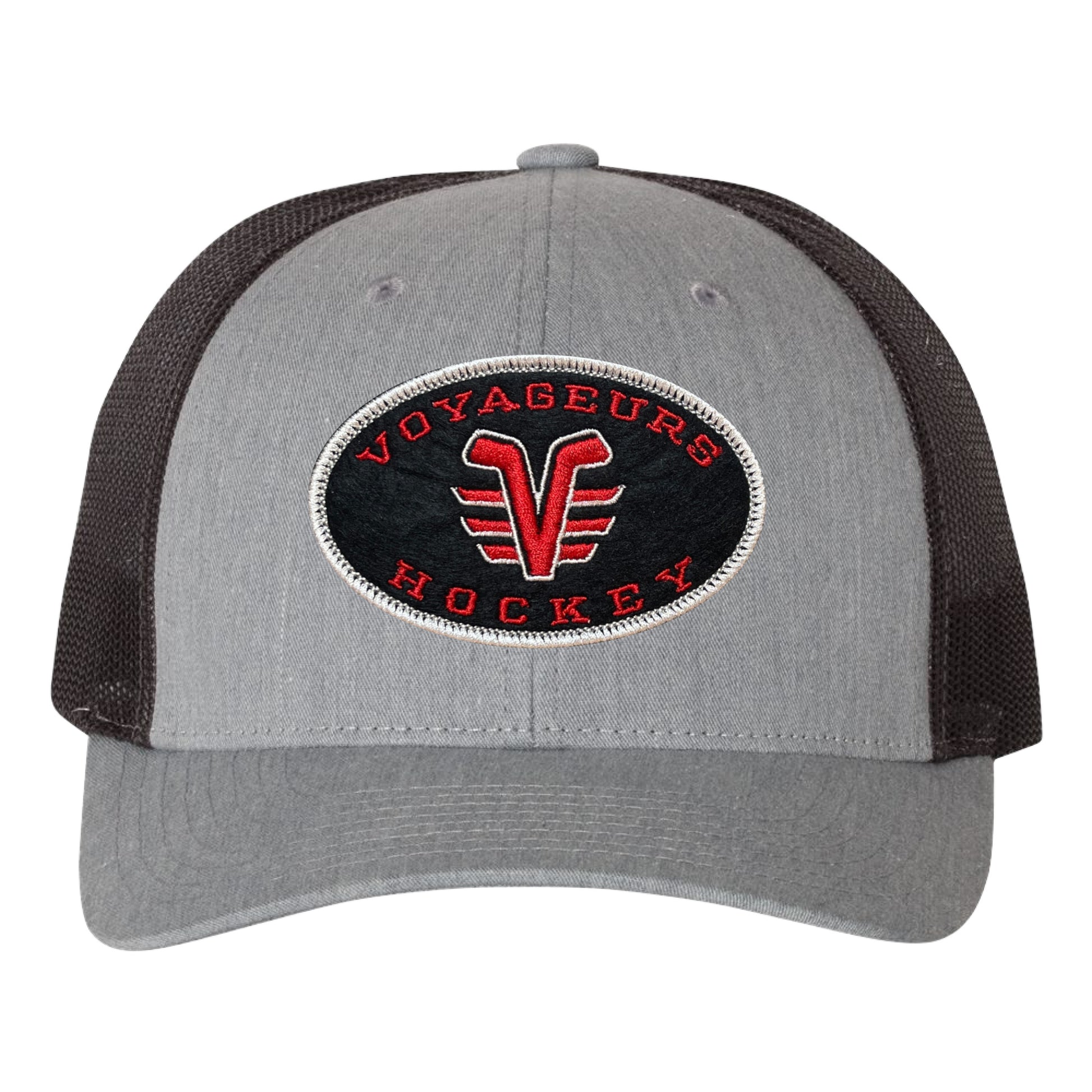 This is the De Pere, Wisconsin High School Voyageurs Hockey Team Logo Patch on our popular Low-Profile Richardson 115 Snapback hat. Show your Voyageurs pride in style with this heather gray snapback. This is one of our best fitting hats and a favorite in our shop, for years, in many different colors and patch styles.