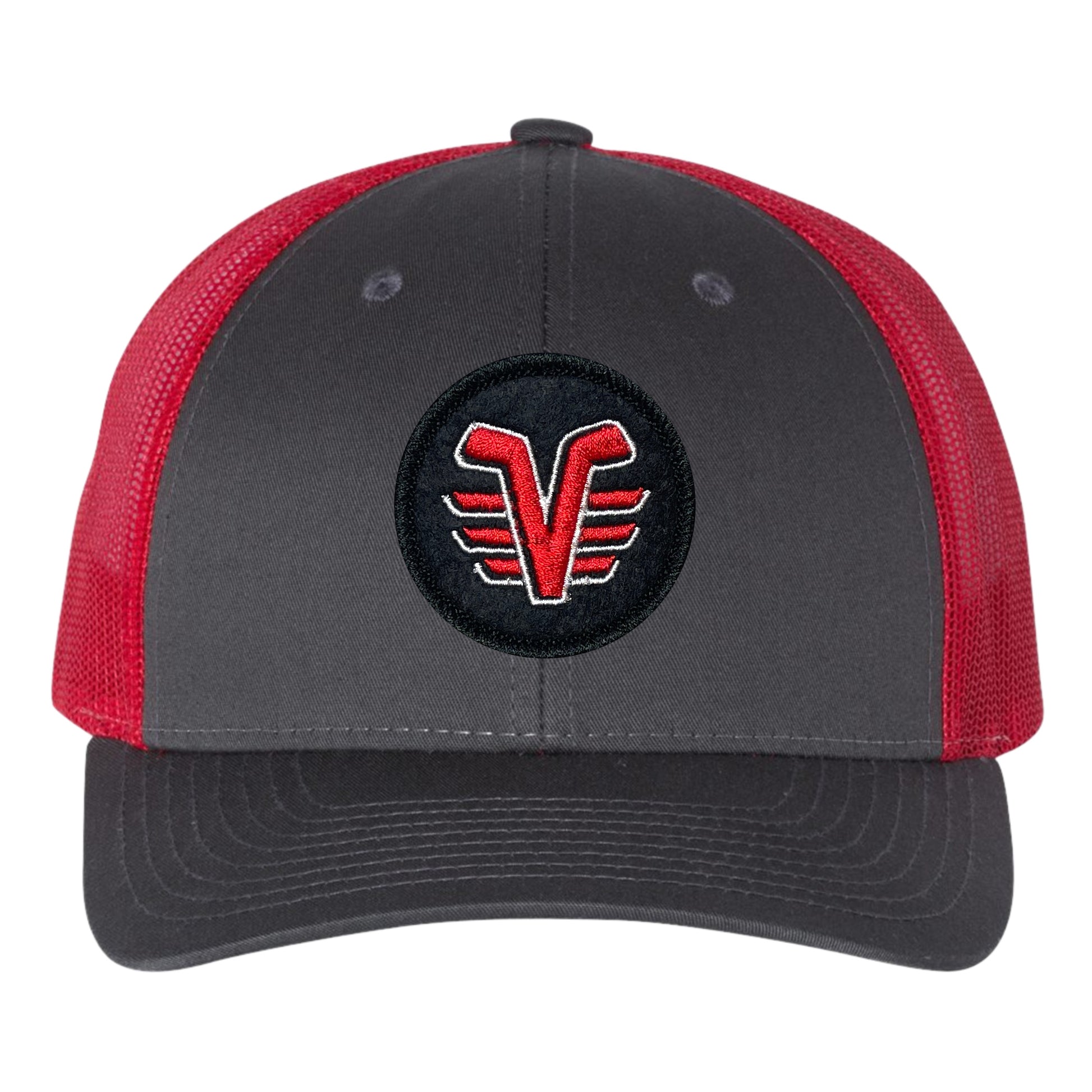 This is the De Pere, Wisconsin High School Voyageurs Hockey Team Logo Patch on our popular Mid-Profile Richardson 115 Snapback hat. Show your Voyageurs pride in style with this charcoal gray and red snapback. This is one of our best fitting hats and a favorite in our shop, for years, in many different colors and patch styles.