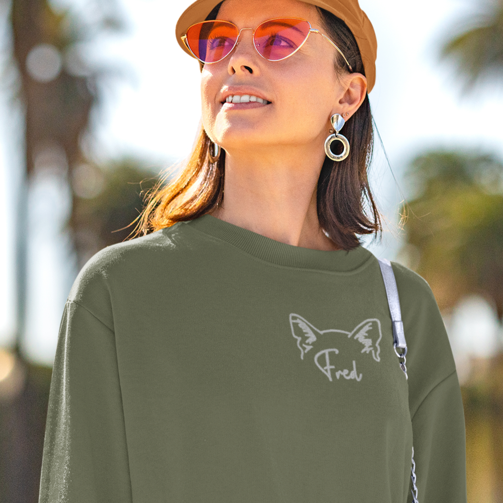 Military Green Custom Embroidered Crewneck Sweatshirt - Cat Ears with Name