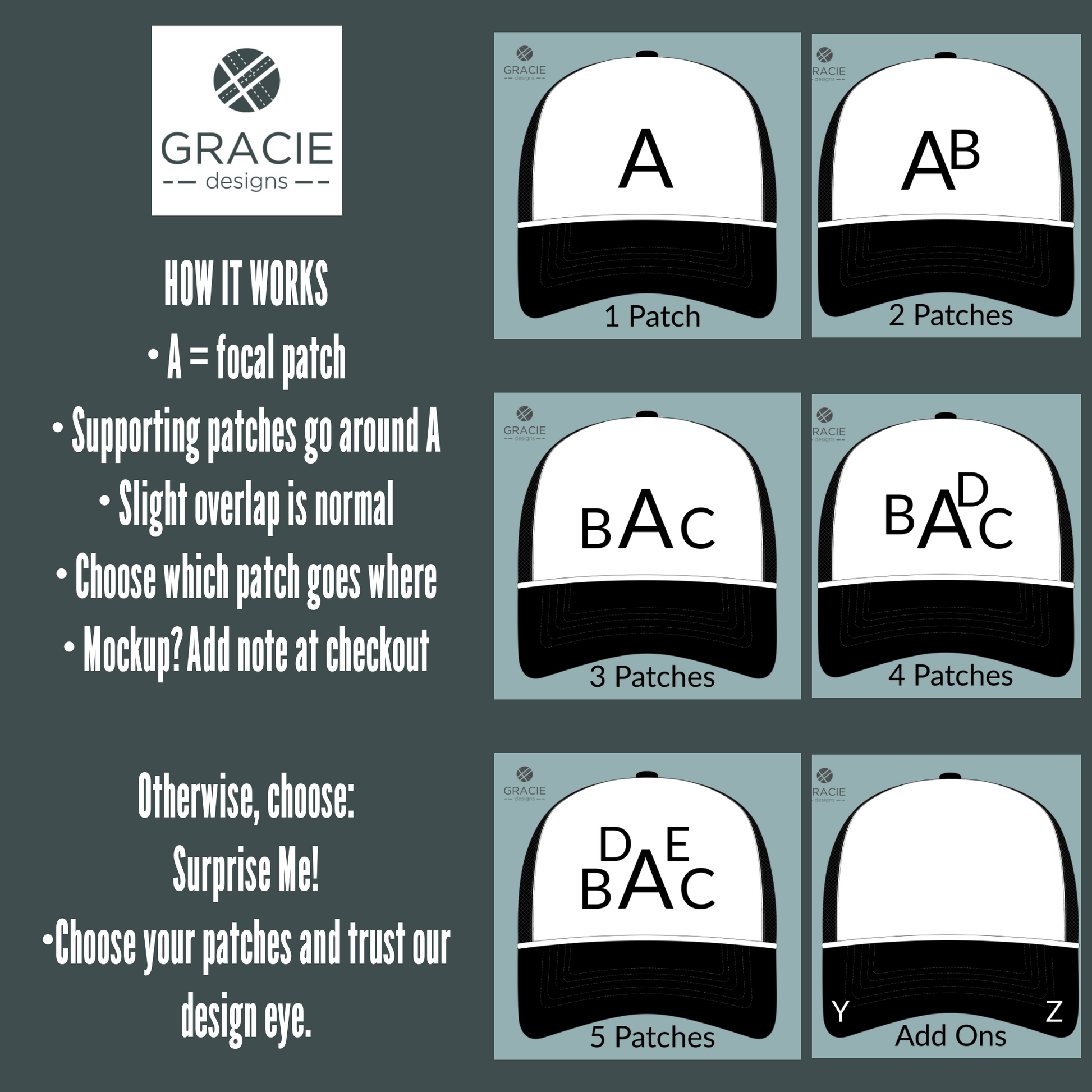 - Match patch numbers to placement letters shown on the hat diagrams.