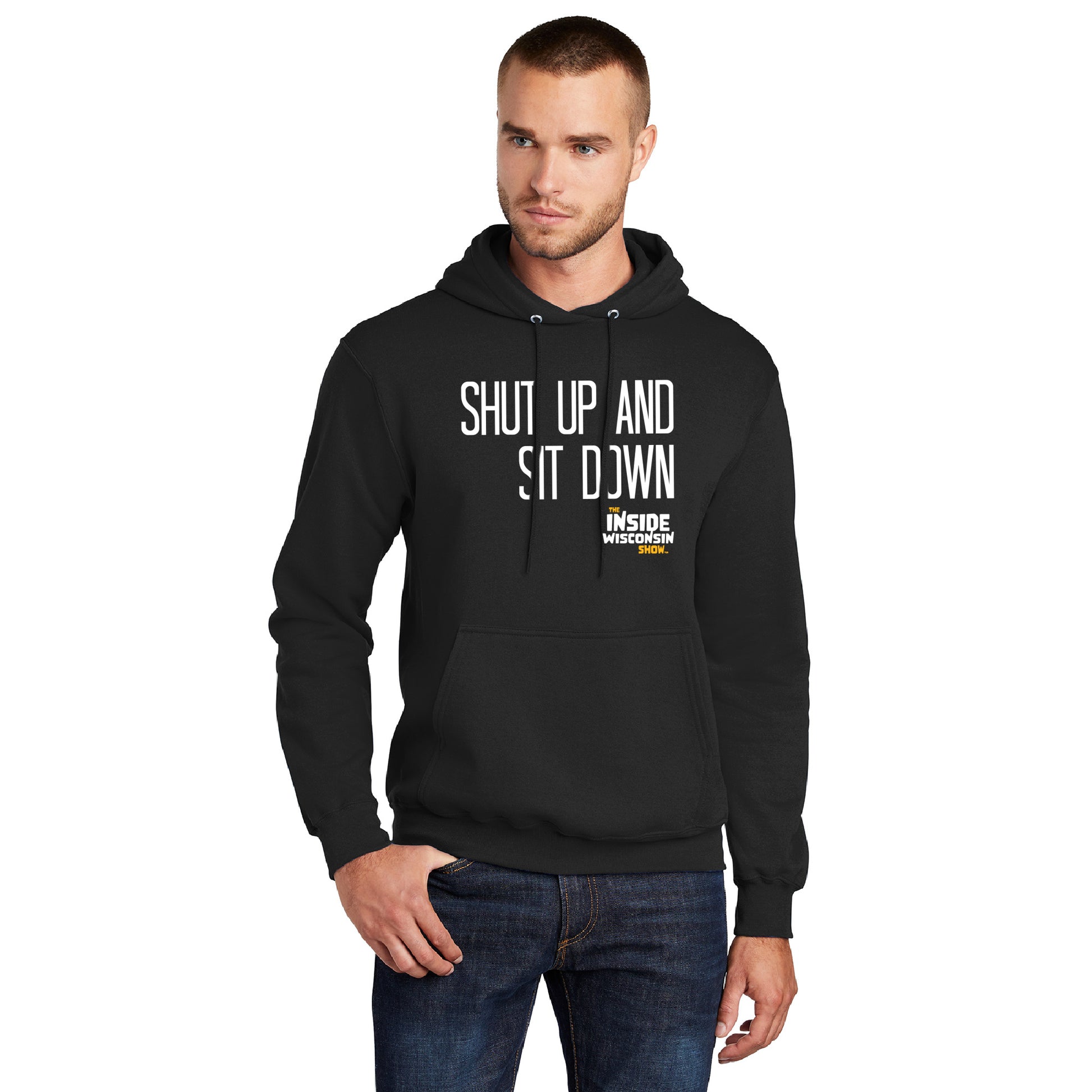 Stay cozy and show your Wisconsin pride with this Shut Up and Sit Down hoodie inspired by the popular podcast The Inside Wisconsin Show. Perfectly designed for fans, this hoodie combines comfort and style in one essential piece.